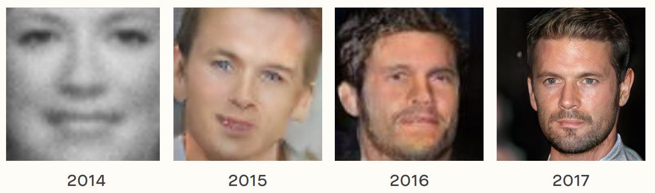 Increasingly realistic synthetic faces generated by variations on Generative Adversarial Networks (GANs). From left to right: Goodfellow et al (2014), Radford et al (2015), Liu and Tuzel (2016), Karras et al (2017). From General Framework for AI and Security Threats