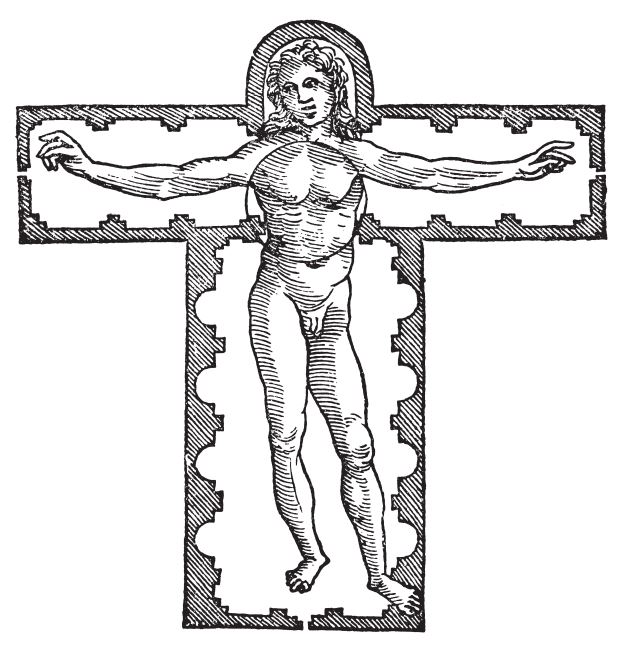 Vitruvius' seminal work included an analogy that became a central inspiration to renaissance designers, which was the relationship between the microcosm of man and the macrocosm of the earth. Applying this analogy to the design of temples, Vitruvius argued that the layout of a building should reflect the proportions of an idealized human body: