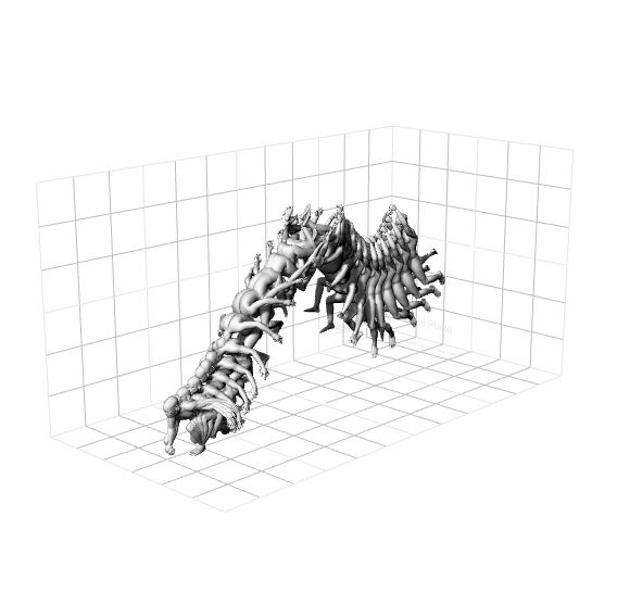(left) A 3d mesh model of a human form in motion. (right) A 3d surface model of an assigned case study building