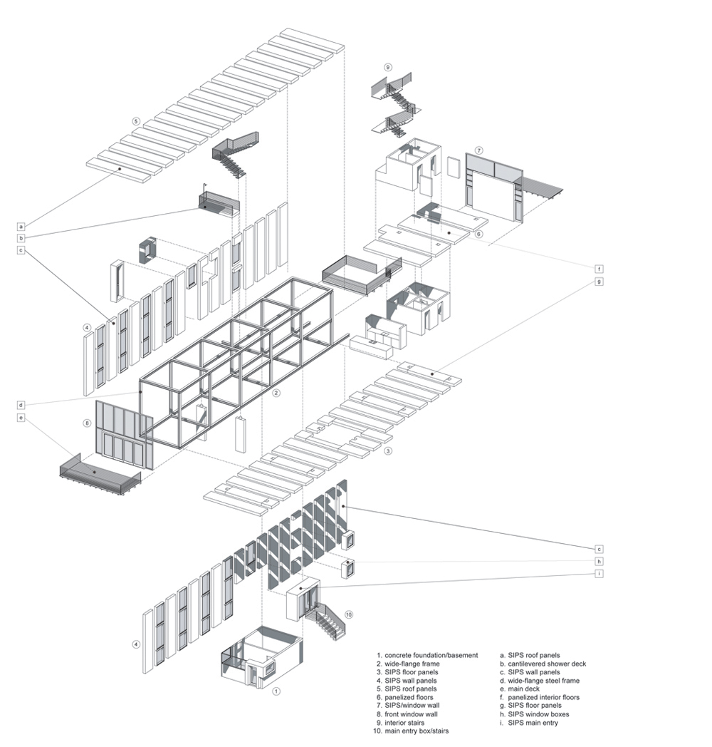 An exploded axonometric takes the original construction of an object and displaces selected elements to illustrate construction assembly or, in the context of architecture, spatial relationships. Exploded axonometrics can be extremely detailed, such as a construction detail, or can be more diagrammatic, such as in a program or circulation diagram.