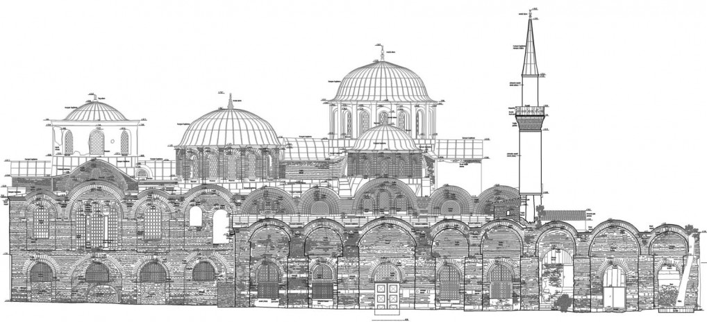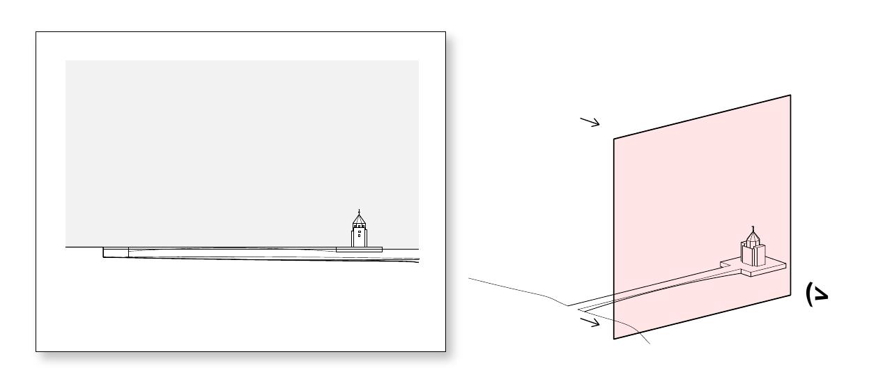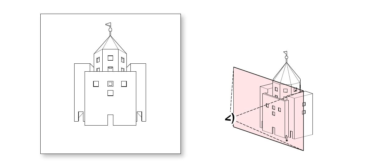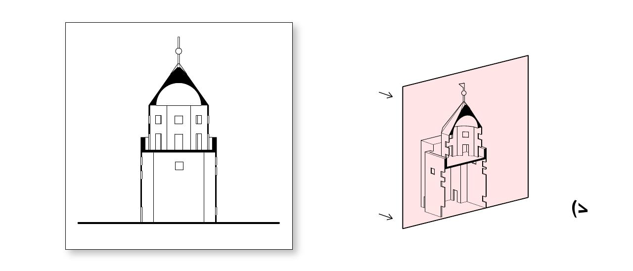 At first blush, an architectural elevation does not seem like a sectional drawing at all, as the projection plane does not intersect any objects of interest. Seen another way, we may define an elevation as an architectural section in which the projection plane is positioned near to, but not intersecting the objects or space of interest. Section or non-section: in either case, architectural elevations are useful for describing the exterior composition of a building, and the way in which it sits on a site or in relation to neighboring buildings.