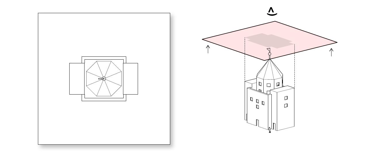 A drawing for which the draw plane is positioned parallel with the ground and above the building as a whole, such that the roof of the entire building is visible. Shadows are often added to demonstrate the mass of the building in reference to the surrounding site. Typical scale: 1/16"=1' or smaller.