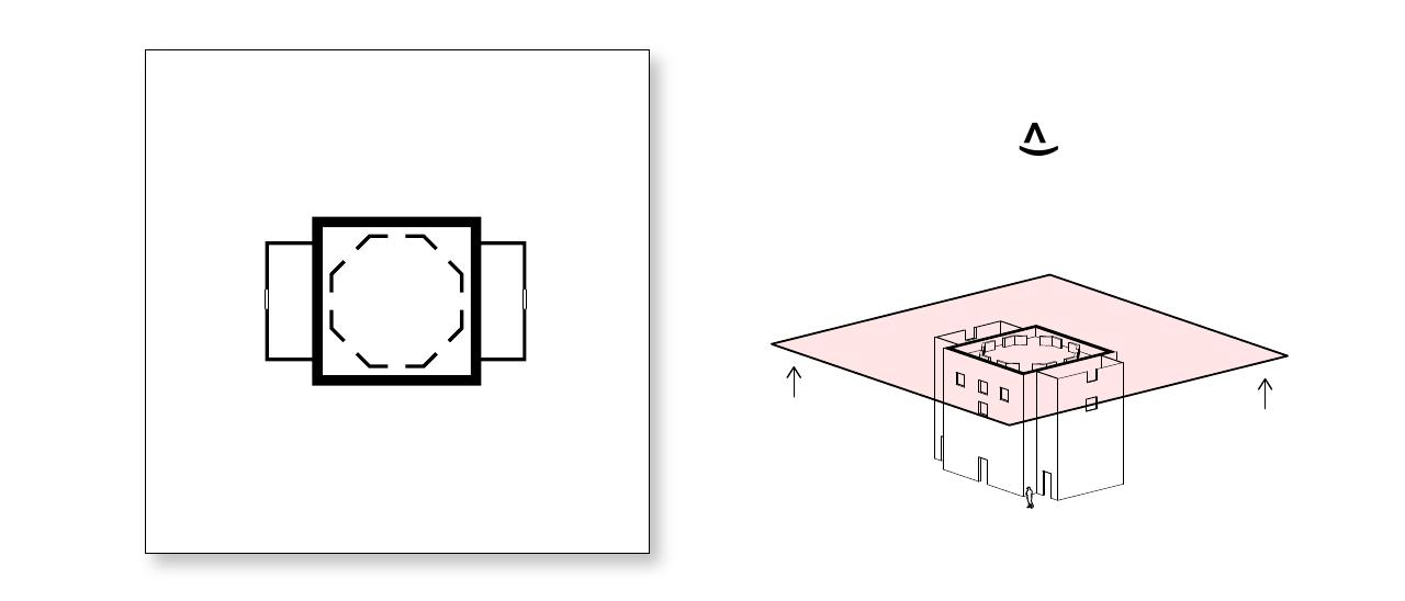 An architectural axonometric is subset of orthographic projection, and includes any drawing wherein the projection plane is positioned at a non-perpendicular angle relative to the ground or the object depicted. Drawings such as this, although they depict three-dimensions, tend to take the viewer 'out' of the space in question and offer a disembodied point of view.