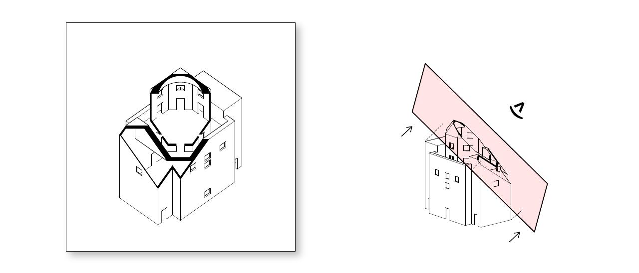 A section perspective is a composite drawing which combines a section through the building, room or detail, with the perspective view that would appear beyond that cut. Not generally used in actual documentation, they are a valuable tool for presentation drawings and process and study work. They are good at illustrating the project narrative (much like a rendering) and, in place of conventional section, they may be more dynamic in conveying the relationship between spaces.
