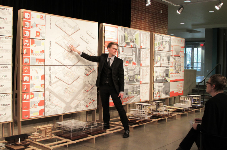 The initial lines of the drawing that help to lay out the drawing on the page and create the basic geometry and guides for the rest of the drawing. These lines are to be drawn very lightly - dark enough for you to see while drawing, but delicate enough to be easily erased later. Though these lines are typically erased for construction documents, they may be found in presentation drawings to assist the viewer in graping the salient relationships at work. Though these are light lines, it's important to remember that these are still intended to be visible - do not confuse "light" with "hard to see."