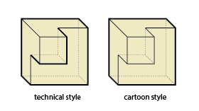 This latter category is not universally treated as a silhouette, as can be seen in the difference between "technical style" and "cartoon style" applications of line-weight in axonometric in the nearby image.