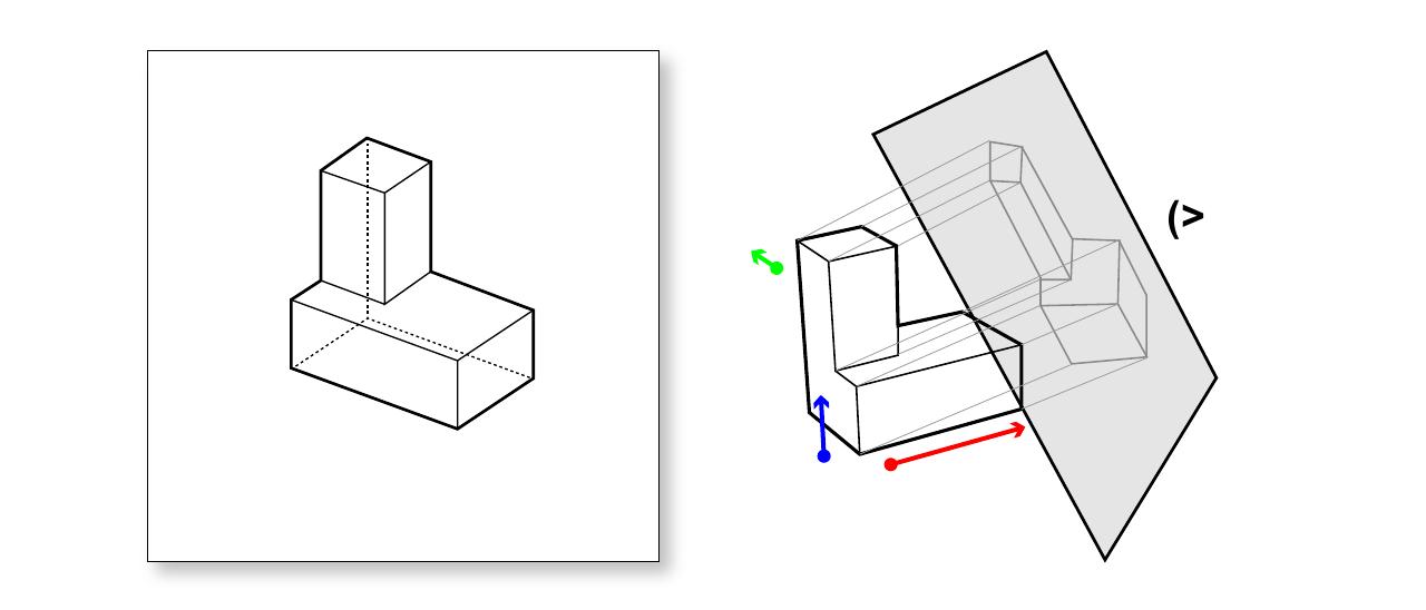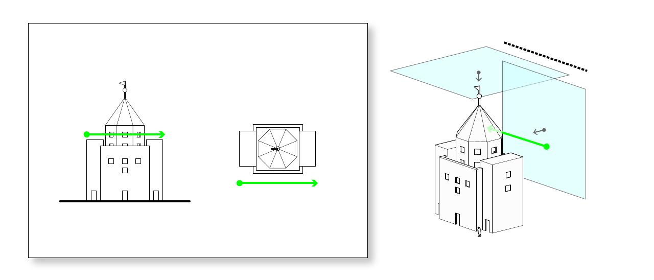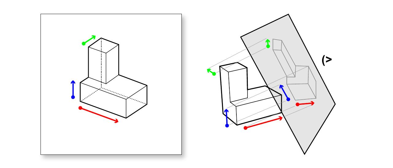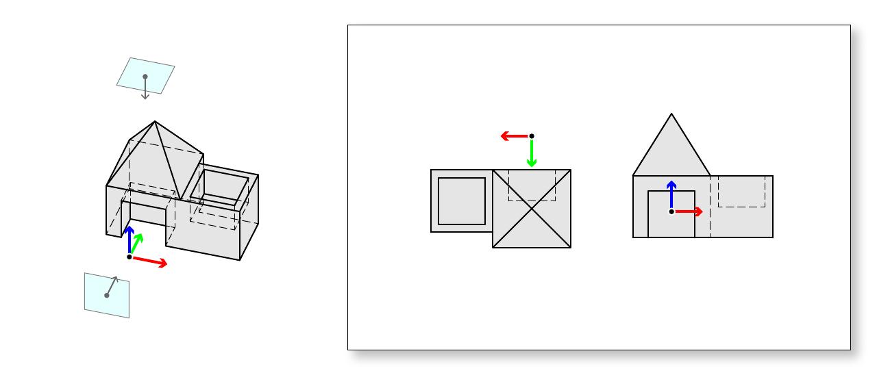 In the case of the pair of views shown above, only one spatial dimension fulfills these requirements: that represented by the green arrow. We may notice that this arrow happens to align with the intersection of the two draw planes. This is no coincidence, and is the basis for the "glass box" metaphor of registering graphic projection drawings.