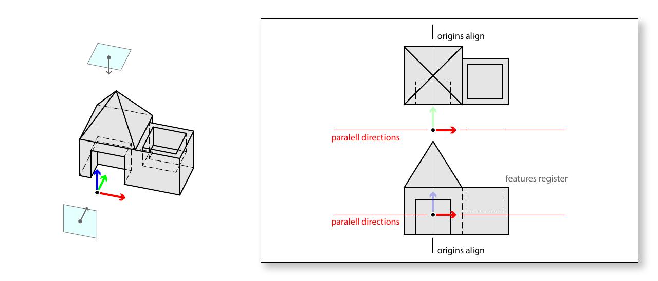 This observation leads us to the first rule of registering graphic projection drawings: For two drawings to "share" a spatial dimension, this dimension must be perpendicular to the normal direction of the draw plane of both drawings.
