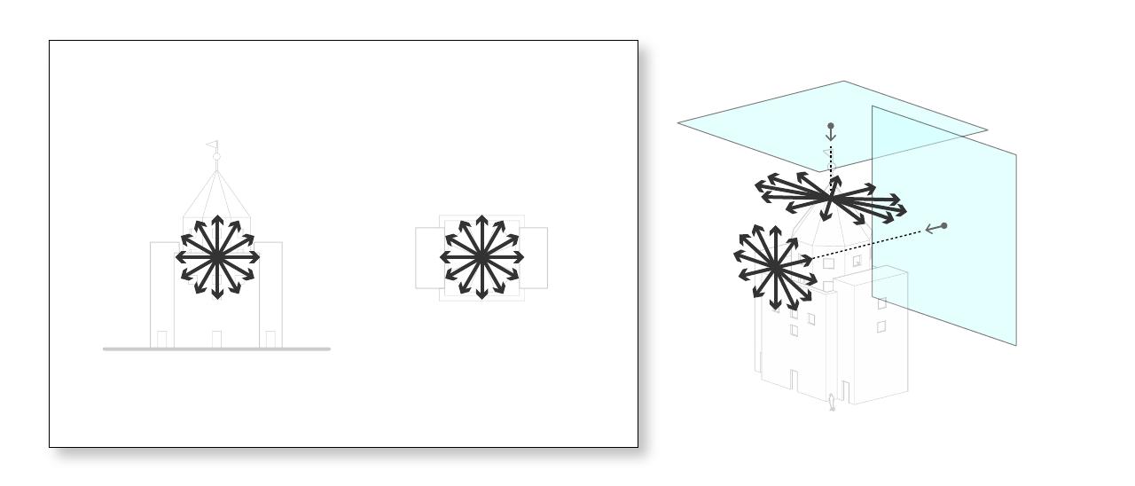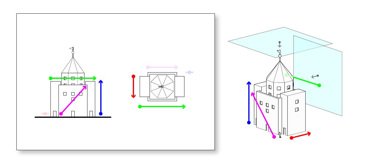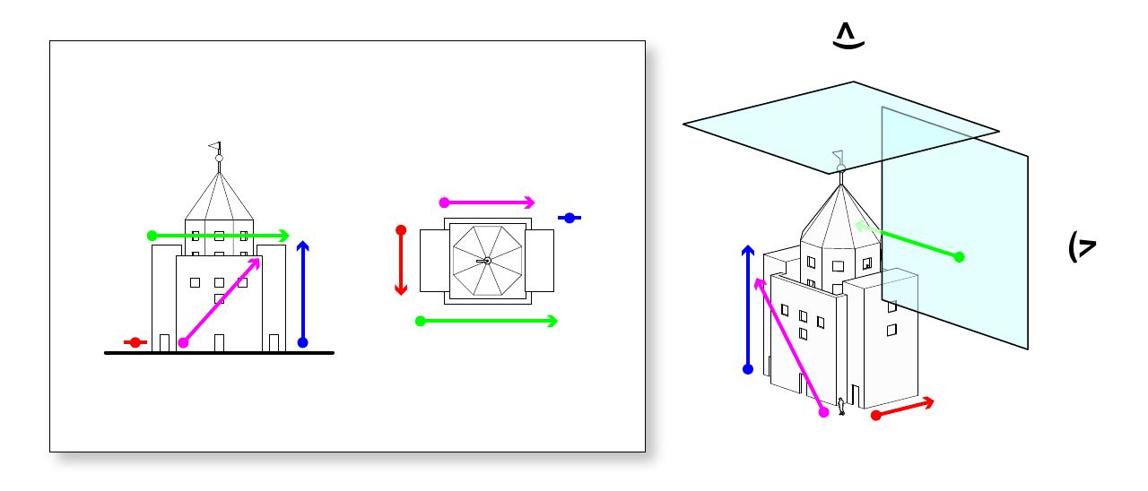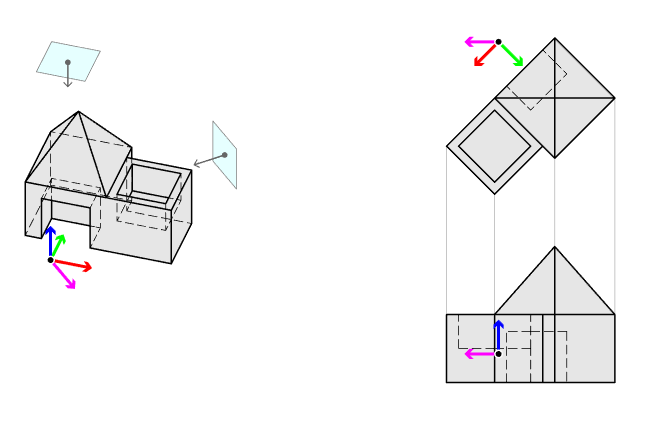 This pair of orthographic views demonstrates the different ways in which spatial dimensions can be projected. We can see here that:
