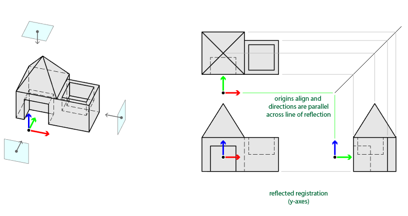 Once registered, the perpendicular lines that connect the origins of the two dimensions may be called "registration" lines. Registration lines connect corresponding locations in each view. In this way, any object appearing at a given position along the x-axis in plan may be found at a corresponding position in the front view.
